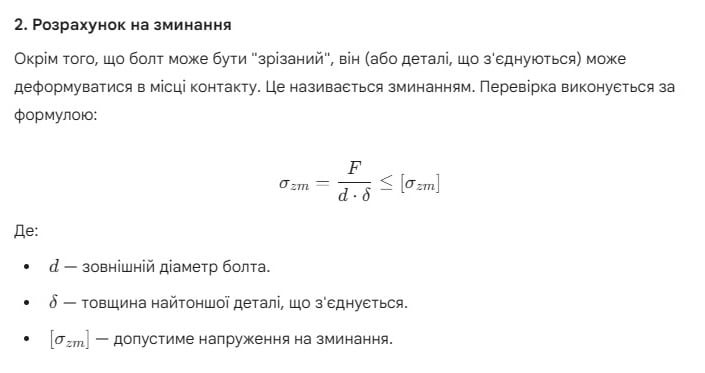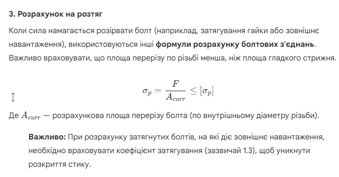 Попередній натяг — це сила, яка створюється при затягуванні болта (момент, що крутить). Він необхідний для герметизації стику (у випадку фланців) та для забезпечення тертя між з'єднуваними деталями. У розрахунках це враховується через коефіцієнт затягування, щоб зовнішнє навантаження не призвело до "розкриття" стику. Це критично важливо, оскільки при правильному натягу основне навантаження на зсув бере на себе тертя, а не стрижень болта.