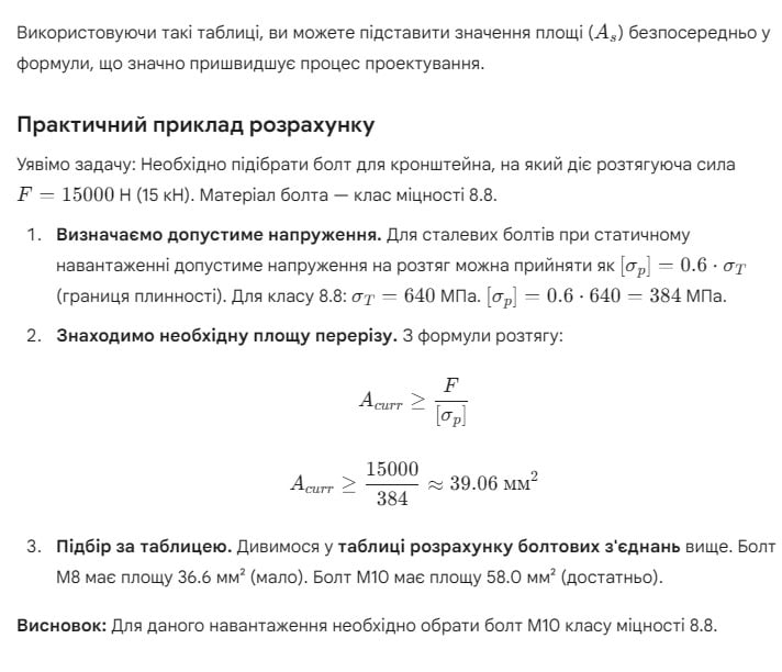Для швидкого підбору кріплення інженери часто використовують готові таблиці розрахунку болтових з'єднань, які містять вже обчислені площі перерізів та допустимі навантаження для стандартних різьб.